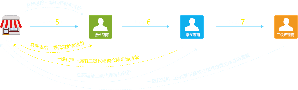 例如總部設置:一級代理5折、二級代理6折、三級代理7折。